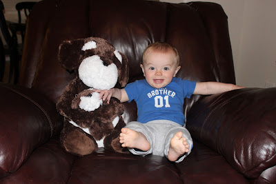 My baby is 1 year ALREADY! :( How does the time go so fast? This first year flew much faster than Madison's first year. My super happy, laid back, easy going, wild, climbing little boy was 23lbs 12oz at his check-up!!! I just LOVE him to pieces!! He's finally starting to learn how to sleep past 6:00am!! YIPPEY!! :) He still ADORES his big sister!! It's so fun watching them interact. He took his first 4 steps four days before his first birthday. He still hasn't done much more. He isn't patient enough to take his time to walk. He'd rather crawl super fast to get where he is going. I guess it will be anytime now!